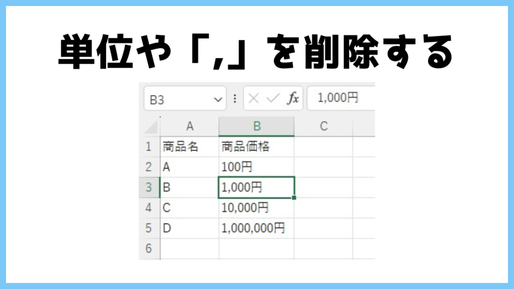 以上のやり方で単位やカンマのような文字列を削除できます。