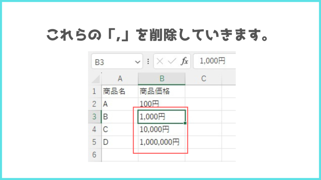 B列にある価格の「,」を削除してC列の表示させていきます。
