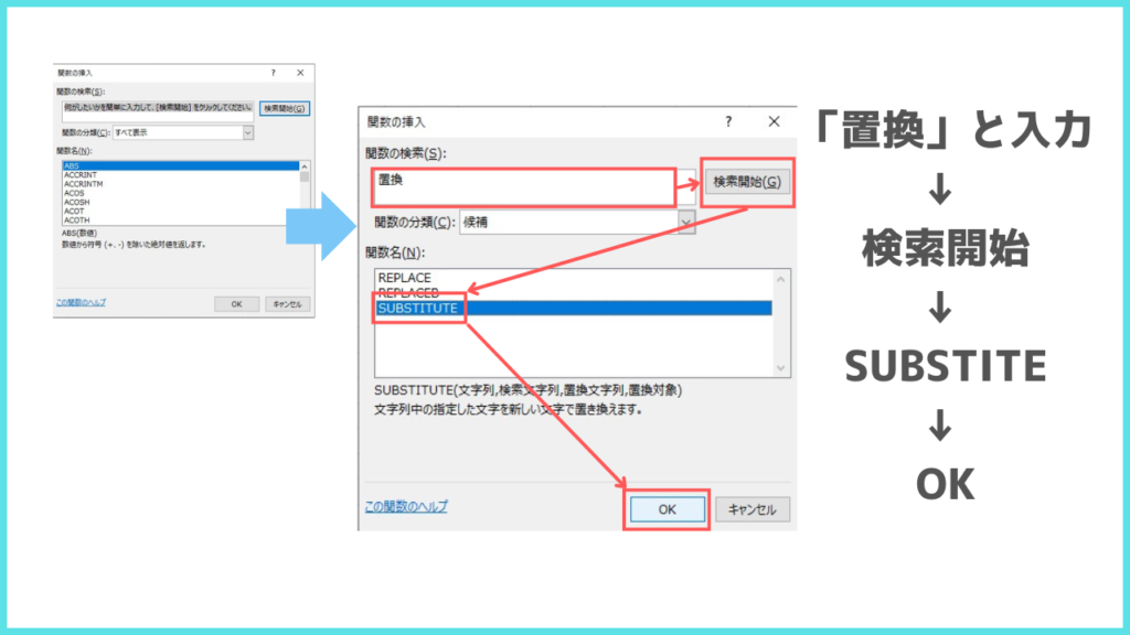 関数の検索という場所に「置換」と入力(「」は不要です。)
