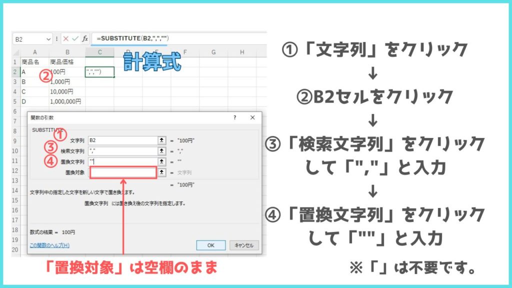 =SUBSTITUTE(SUBSTITUTE(B2,”円“,””),”,“,””)