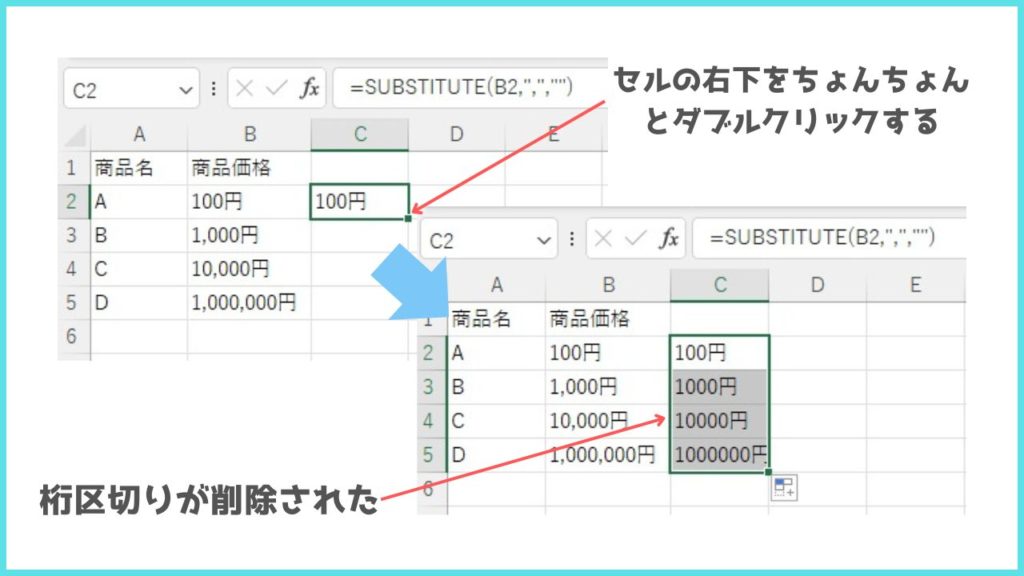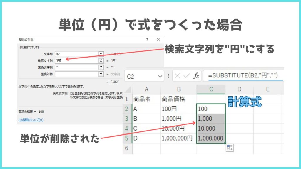SUBSTITUTE関数を使って単位を削除するのも、桁区切り「,」を削除するのも方法は同じです。