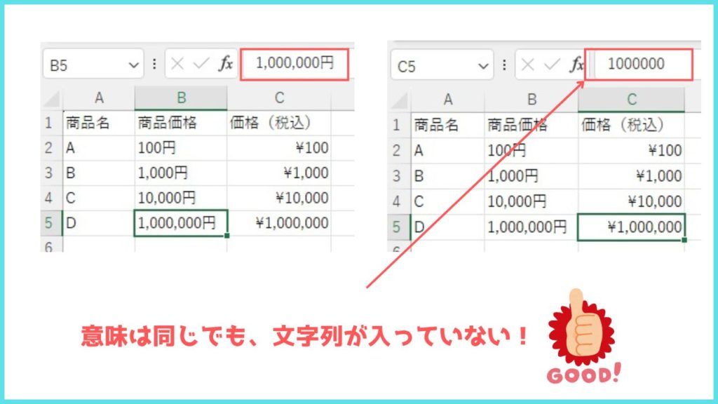 通貨に限って言えばセルに文字列を表示させつつも数列として扱うことができます。