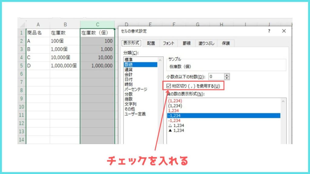 そんなときは、セルの書式設定を「数値」に変更して、「桁区切り(,)を表示する」にチェックを入れるだけです。